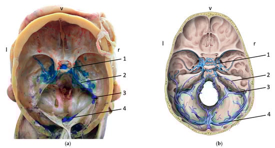 Illustration of the intracranial aspect of the dural sinuses. (a) A specimen’s intracranial aspect after removal of the calvaria and the brain. The dispersion of the latex injected via the facial vein into the (1) cavernous sinus, (2) the superior petrosal sinus, (3) the sigmoidal sinus, and (4) the transverse sinus is indicated. (b) A schematic overview over the intracranial dural sinuses. (1) cavernous sinus, (2) the superior petrosal sinus, (3) the sigmoidal sinus, and (4) transverse sinus are indicated; v—ventral, l—left, and r—right.