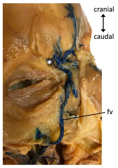 The right side of a male specimen’s face. The facial vein (fv) was injected with blue latex and carefully dissected. The anastomosis between the facial vein and the superior ophthalmic vein (*) can be seen.