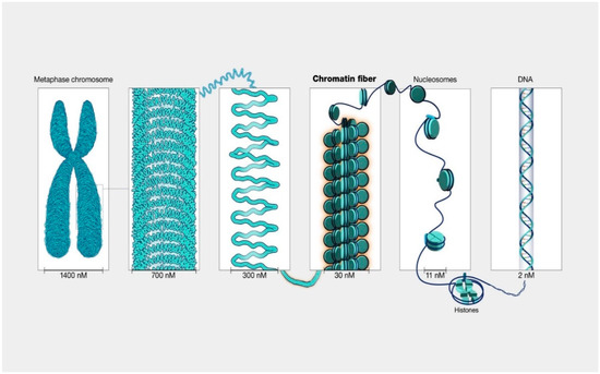 - Luger, K.; Mader, A.W.; Richmond, R.K.; Sargent, F.; Richmond, T.J. Crystal structure of the nucleosome core particle at 2.8 Å resolution. Nature 1997, 389, 251–260. [Google Scholar] [CrossRef]