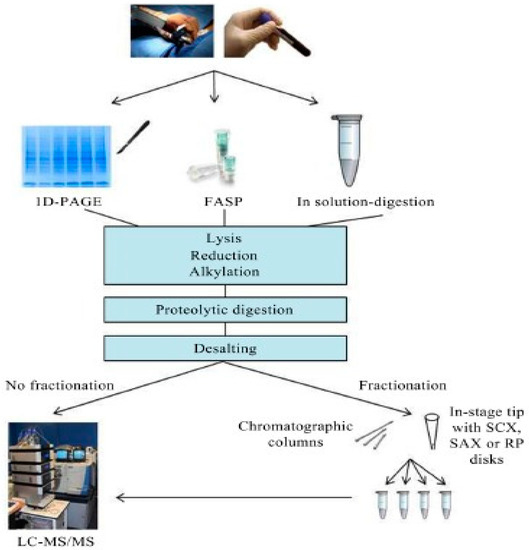 Proteomic workflow comprising three approaches for sample preparation, including filter-assisted sample preparation (FASP). (From Aasebø, E.; Forthun, R.B.; Berven, F.; Selheim, F.; Hernandez-Valladares, M. Global Cell Proteome Profiling, Phospho-signaling and Quantitative Proteomics for Identification of New Biomarkers in Acute Myeloid Leukemia Patients. Curr. Pharm. Biotechnol. 2016, 17, 52–70).