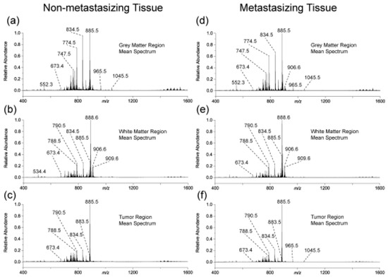 Medulloblastoma (MB) is the most common malignant pediatric brain tumor known to be characterized by high incidence of metastasis of the central nervous system, a characteristic which calls for highly aggressive cure, including prophylactic radiation administered to the entire brain and spine. Unfortunately, such highly aggressive regime leaves the majority of long-term survivors with permanent and debilitating neurocognitive impairments, while the remaining patients relapse with terminal metastatic disease. This dramatic scenario underlines the need for a more targeted and possibly more effective therapies. It goes without saying that to achieve such tantalizing objective, a further understanding of the various mechanisms regulating this disease, particularly the process of metastasis, is necessary. Mass spectrometry-based methods can give a valuable contribution to realize such goal. A recent work by Paine et al. [52] is a representative example in this direction. The authors used MALDI-mass spectrometry imaging to examine whole brains from SmoA1 mice. The authors reported that the disease progression in these species faithfully recapitulates the pattern of tumor progression in humans. Briefly, six mice brains were collected under identical conditions: three brains containing non-metastasizing primary tumor and three brains containing a metastasizing primary tumor. These brains were segmented into three main regions and examined by MALDI-TOF operating in negative ion mode. The mean mass spectra for the three segmented regions from both non-metastasizing and metastasizing MB mouse brains are shown in Figure 5.
