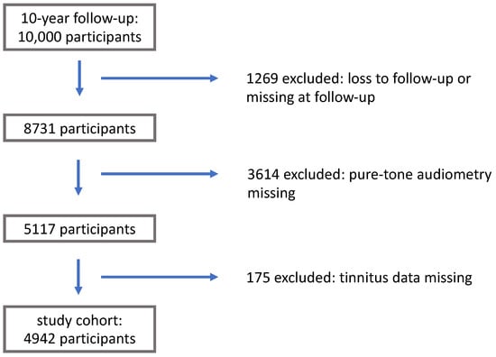 The Gutenberg Health Study (GHS) is a large, population-based cohort study. As a monocentric study, it covers the area of the city of Mainz and the district of Mainz-Bingen. By randomly drawing participants from the residents’ registration office, the study results are representative for this area. In addition, the study cohort is stratified by sex, residence (rural vs. urban) and age. The GHS was initiated in 2007 at the University Hospital Mainz, Germany. Ten years later, the first study phase (baseline) was successfully completed. At the 10-year follow-up after baseline (10-FU, from 2017 and 2020), an otologic examination was added to the study protocol. Participants were asked “Do you suffer from ringing in the ears (tinnitus)?” (yes/no). They were also asked, “How much do you feel burdened by it?” and requested to rate their tinnitus on a six-level scale ranging from “little stressful” (=1) to “extremely stressful” (=6). Pure-tone audiometry for air- and bone-conduction was performed at an otologic testing station by trained study nurses. Testing was performed separately for both ears at the following frequencies: 0.125, 0.25, 0.5, 0.75, 1, 2, 3, 4, 6, 8 and 10 kHz. All tests were performed with the Auritec® AT1000 clinical audiometer and in a soundproof booth. A detailed description of the methodology can be found elsewhere [,].