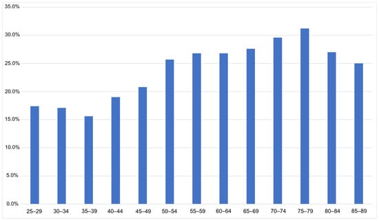 A total of 4942 participants were included (2550 men and 2392 women). The mean age was 61.0 years (SD: 13.3) (see Table 1). Of the 4942 participants, 1289 indicated that they had tinnitus (26.1%; 95% CI [24.9%; 27.3%]). Men were more commonly affected than women (tinnitus prevalence of 30.2% in men (n = 770) and 21.7% in women (n = 519), p-value < 0.0001). Tinnitus prevalence increased with age, peaking at 31.2% in the 75–79 age group (Figure 2). Only 6.7% of the participants who reported having tinnitus also reported having been treated for their tinnitus in the past two years.