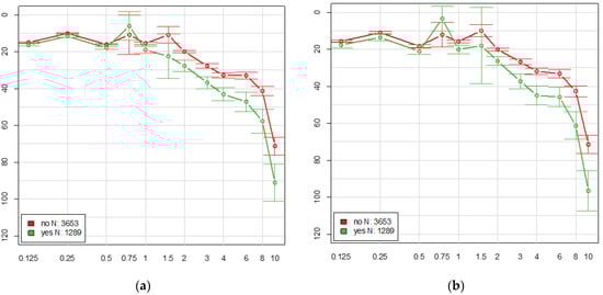 Mean hearing levels (pure-tone audiometry, air conduction), x-axis: frequencies in kHz, y-axis: mean hearing level in dB. (a) left ear, (b) right ear; red: participants without tinnitus, green: participants with tinnitus.