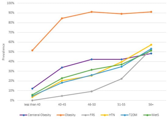 Prevalence of different cardiometabolic risks among the studied sample according to their age. Obesity: Body Mass index more than 25 kg/m2, FRS: High/intermediate Framingham Coronary Heart Risk Score, HTN: Hypertension, T2DM: Type 2 Diabetes Mellites, MetS: Metabolic Syndrome Score.