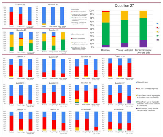 A total of 94.3% of the users were satisfied with their ability in software’s handling (Q38); furthermore, this software turned out not to be time consuming during the surgical procedure for 94.2% of the attendees and did not cause any stress in 90.4% of the physicians that exploited ICON3DTM technology (Q40).