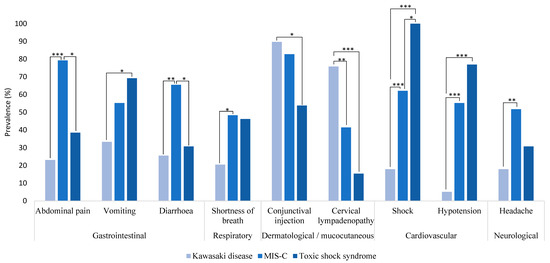 Clinical characteristics of patients with KD, MIS-C and TSS. * (p < 0.05), ** (p < 0.01), *** (p < 0.001).