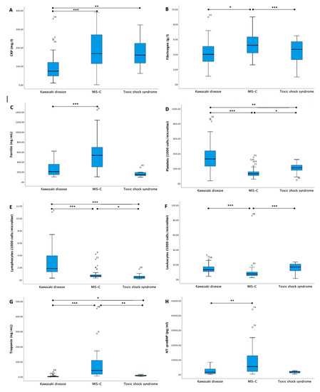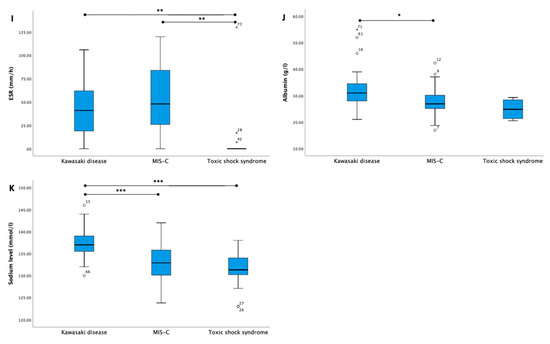 Laboratory markers of patients with MIS-C, KD and TSS (levels of significance * (p < 0.05), ** (p < 0.01), *** (p < 0.001)).