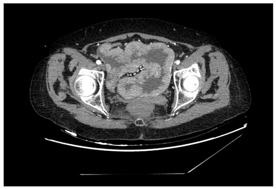 Later, the patient was treated due to acute kidney injury (AKI) and hypokalemia in 2020. A computed tomography (CT) scan was performed, which accidentally suspected a circularly thickened wall of the large bowel in the left lower quadrant. Therefore, a colonoscopy was performed. Atypical mucous membrane changes were identified, starting 20 cm from the anus, and continuing for about 30 cm long. Prominent, polypoid-shaped formations included large, confluent areas. A biopsy was taken. The lumen of the colon was slightly narrowed due to these formations and was full of continuous whitish mucus, but the endoscope could pass through it. The symptoms decreased after the conservative treatment. Unfortunately, the elective consultation with an abdominal surgeon did not take place due to the COVID-19 pandemic.