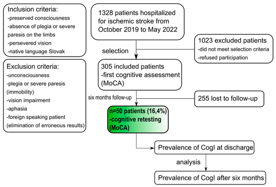 We prospectively included patients with an ischaemic stroke admitted to the Neurological Department of the UPJŠ Faculty of Medicine and L. Pasteur University Hospital in Košice in the period from October 2019 to May 2022. The study was approved by the Ethics comittee of L. Pasteur University Hospital in Košice and complied with the Declaration of Helsinki (World Medical Association). Only patients who fulfilled selection criteria and underwent a control examination of cognitive functions after 6 months were included in the final analyses (Figure 1).