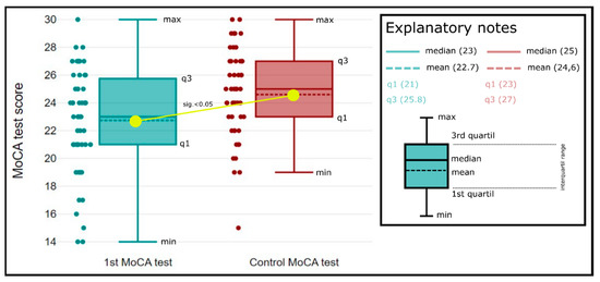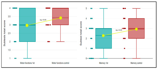 The results of the individual domains of the MoCA test—executive functions (TMT test), motor and construction/visuospatial abilities (cube drawing, clock test), language (naming, repetition, phonemic verbal fluency), attention (number repetition, A-test, subtraction), abstract thinking and memory (delayed recall)—are summarised in Table 2. A significant improvement in the MoCA score after 6 months was registered in the domain of motor and constructional/visuospatial functions and in the domain of memory (Figure 3).