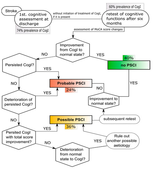 Our study showed that the prevalence of CogI in a sample of patients with an ischaemic stroke at discharge was 74% and the prevalence after 6 months was 60%, with a significant change in the total MoCA score suggesting the importance of retesting. Only with time can we say with greater accuracy whether PSCI is present. Based on our results, we can establish the diagnosis of PSCI only after retesting the cognitive functions, and, based on our clinical experience, observation of changes in cognitive functions in patients after ischemic stroke and available prevalence and overview studies were proposed as the algorithm for the diagnosis of PSCI, as shown in Figure 4. According to the proposed algorithm, we registered 12 patients with probable (true) PSCI, 20 patients without PSCI, and 18 patients with possible PSCI who required a follow-up cognitive function examination, which means that they cannot be definitively labelled as PSCI after 6 months. If we counted only patients with probable PSCI, the true prevalence would then be only 24%. A larger prospective study is needed to validate this algorithm.