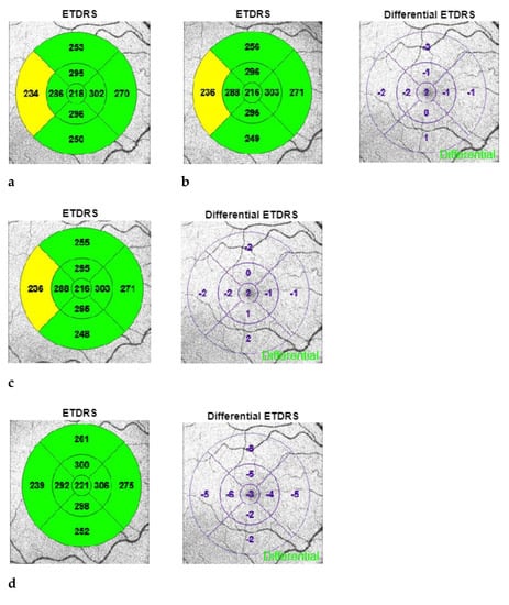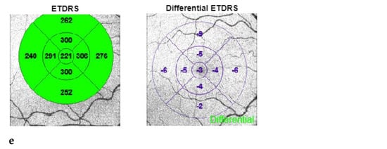 12]. The wide-angle OCT measurement (Topcon Triton Plus, Japan) of the macula was performed using a 9-field segmentation according to the ETDRS grid. This examination was carried out at each point of the postoperative follow-up and analyzed as shown using a patient example in