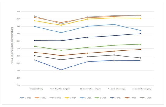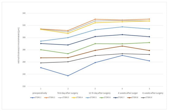 Figure 3, the macular thickness reduction on the first postoperative day with a consecutive increase in macular thickness at the following time points can be seen clearly.
