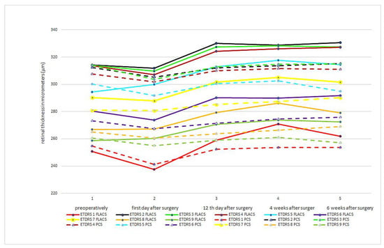 Figure 4, we superimposed curves of the macular thickness values of the FLACS and PCS groups, obtained according to the ETRDS scheme, as a direct comparison at each pre- and postoperative time point. As in