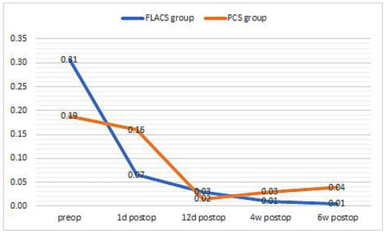 p = 0.006 in the FLACS group and 0.16 ± 0.099 logMAR in the PCS group, which was not significant