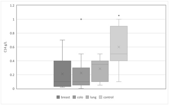 The serum concentrations of C4 in studied groups with C1-INH-AAE. Legend: breast—breast cancer; colo—colorectal cancer; lung—lung cancer; *—significantly higher average concentration of C4 in control groups, p < 0.05.