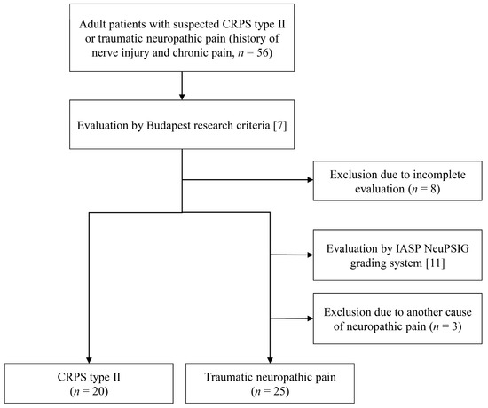 Among the 56 patients with chronic pain (more than 2 months) with a history of nerve injury history, 8 were excluded due to deviation from the evaluation process. Twenty patients were diagnosed with CRPS type II, and the remaining twenty-eight patients were re-evaluated using the IASP NeuPSIG grading system [7,11]. All 28 patients were considered as having “definite” NeP; 3 of them were excluded because the disease etiology was metabolic disease, including diabetes mellitus and alcohol abuse. Therefore, 20 patients with CRPS type II and 25 patients with traumatic NeP were finally investigated (Figure 1). The median age of both groups was 40 years (±16.1 in the CRPS type II group and ±14.0 in the traumatic NeP group) (Table 1). There were no significant differences in the body mass index, disease duration, affected site, or etiologies of both the groups. The severity of pain measured by NRS was significantly more severe in the CRPS type II group than in the traumatic NeP group (7.5 ± 1.54, 5.8 ± 1.85, respectively, p = 0.001). Bilateral symptoms were more common in the traumatic NeP group than in the CRPS type II group (ten patients, one patient, respectively; p = 0.012). Patients with psychiatric disorders were more common in the CRPS type II group than in the traumatic NeP group (ten patients, four patients, respectively, p = 0.014). There were no differences in the adjustment of opioids and anticonvulsants, whereas antidepressants were more commonly used in the CRPS type II group than in the traumatic NeP group (16 and 12 patients, respectively, p = 0.035).