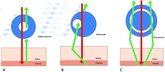 Scanning laser ophthalmoscope: three different aperture types: (A) confocal (with a central aperture). (B) retromode (with a laterally deviated aperture to the left or to the right), and, respectively, (C) the ring aperture.