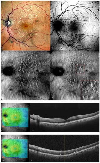 - Garrity, S.T.; Sarraf, D.; Freund, K.B.; Sadda, S.R. Multimodal Imaging of Nonneovascular Age-Related Macular Degeneration. Investig. Opthalmology Vis. Sci. 2018, 59, AMD48–AMD64. [Google Scholar] [CrossRef]
