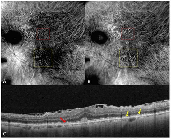 Zeng et al. investigated the utility of retromode imaging in order to detect and characterize PCV []. The results were comparable to ICGA for the polypoidal lesions. Interestingly, retromode was superior to ICGA and fluorescein angiography (FA) for characterizing deep lesions in the RPE and the choroid that appear in PCV. They found no statistically significant differences between retromode and SD-OCT for detecting lesions such as PED, CME, NRD, drusen, or minute granular changes of the RPE. They proposed using retromode as an additional investigation adding up to SD-OCT, ICGA, and FA because it brings comprehensive information about the deep retinal layers and the choroid [].