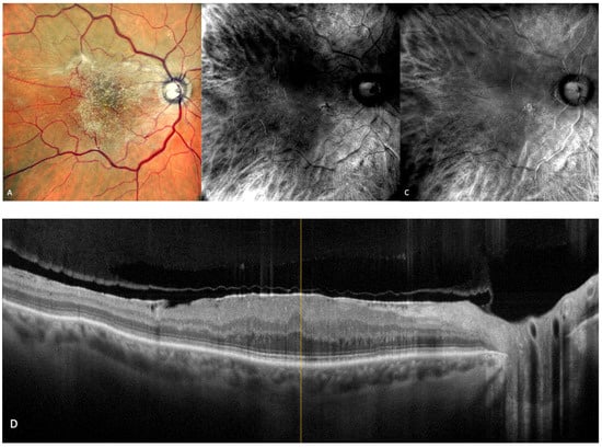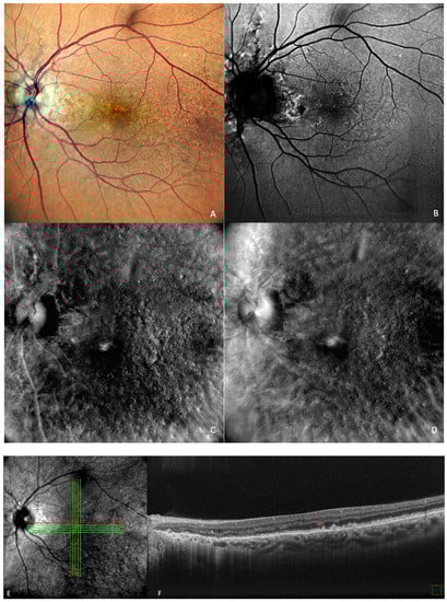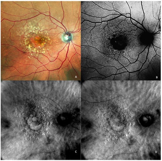 The aspect of GA on a retromode illumination image is represented by a pseudo3D round patch with a homogeneous reflectivity and clearly visible hyperreflective choroidal vessels seen under the retina (Figure 6C,D) [].