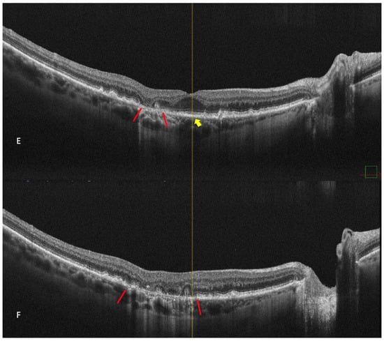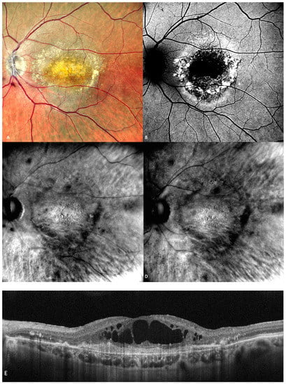 The multimodal images of patients were taken in the clinic as a part of the standard testing protocol. The images were acquired with the Mirante SLO, which provides an image with a field of 40 degrees. The axial resolution of the confocal aperture is about 300 microns. Four separate laser wavelengths—infrared (790 nm), red (670 nm), blue (488 nm), and green (532 nm), coupled with a unique specialized sensor for each wavelength, were used to generate the color SLO images (cSLO) [,]. The SD-OCT images were also acquired with the Mirante platform. All the images were reviewed by one highly experienced retinal specialist in accordance with the diagnostic criteria, in order to identify similar and representative cases consistent with the ones already existent in the literature.