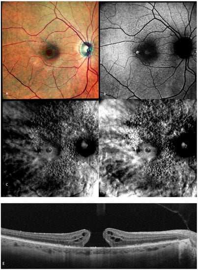 - Maurizio, B.P.; Pierluigi, I.; Stelios, K.; Stefano, V.; Marialucia, C.; Ilaria, Z.; Francesco, B. Retro-mode imaging and fundus autofluorescence with scanning laser ophthalmoscope of retinal dystrophies. BMC Ophthalmol. 2012, 12, 8. [Google Scholar] [CrossRef]