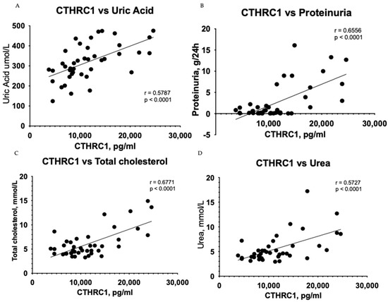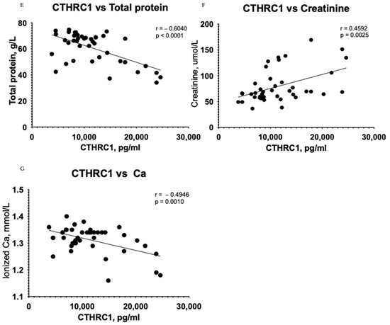 The Pearson correlation test demonstrated that CTHRC1 correlates with many essential clinical markers of kidney function, including 24 h collected total protein levels in urine (r = 0.6314, p = 0.0005) (Figure 1A), uric acid (r = 0.5879, p = 0.0025) (Figure 1B), urea (r = 0.5856, p = 0.0026) (Figure 1D), total protein levels (r = 0.5374, p = 0.0068) (Figure 1E) and eGFR (r = −0.4287, p = 0.0366) (Figure 1H). CTHRC1 and creatinine (r = 0.4878, p = 0.0156) (Figure 1F) were analyzed using Spearman’s rank correlation test.