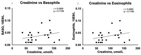 A correlation test showed subsidiary differences between CTHRC1 and blood cells, including WBCs (r = −0.0088, p = 0.9685) (Figure 4A), neutrophils (r = 0.0105, p = 0.9661) (Figure 4B), basophils (r = 0.2432, p = 0.2522) (Figure 4D), and eosinophils (r = 0.2432, p = 0.2522) (Figure 4E) in the CKD group. However, the relationship between erythrocyte sedimentation rate (ESR) and CTHRC1 showed significant correlation (r = 0.5681, p = 0.0038) (Figure 4C). In addition, a correlation analysis between creatinine and similar blood cells displayed a complementary tendency (Figure 4H–J).