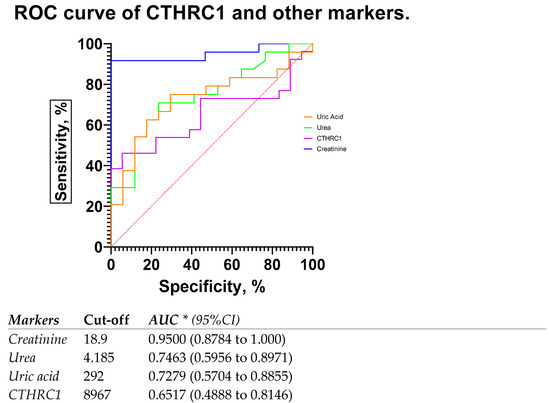 The measurement of blood creatinine concentrations and subsequent determination of the GFR are the foundations of contemporary CKD diagnosis and course monitoring [28]. This method’s drawback is that it performs poorly in terms of early CKD diagnosis. Potential protein biomarkers of CKD have been postulated in a number of studies and assessed in the serum or plasma of patients [29,30,31,32]. Because blood proteins are so accessible, changes in them are frequently observed to help with disease diagnosis. The early stages of the disease can also be diagnosed by changes in blood components. This is particularly true for those with CKD, as changes in renal filtration cause considerable changes in blood composition. For instance, CKD patients have higher serum levels of urea and creatinine, an electrolyte imbalance, and blood clotting. In the present study, we investigated the correlation between CTHRC1 levels and kidney indicators (proteinuria, creatinine, uric acid and urea). It has been reported previously that the CTHRC1 correlates with kidney functions during renal cancer progression; our study revealed that CTHRC1 can be a sensitive, reliable, and more affordable marker for kidney functions. Indeed, using CTHRC1 as a marker for kidney function in clinical practice is suggested by the substantial connection between CTHRC1 and kidney indicators as well as the significant variations in CTHRC1 between the control group and CKD patients.
