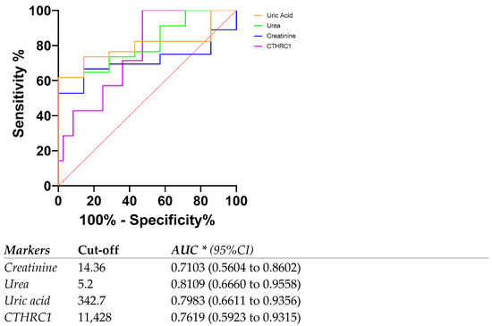 ROC curve and AUC for CTHRC1 levels and other markers in patients with eGFR rates below 60 mL/min/1.73 m2 (eGFR < 60). Cut-off values were defined as the value whose sensitivity and specificity are the closest to the value of the area under the ROC curve. * Area under ROC curve lies with 95% confidence interval.