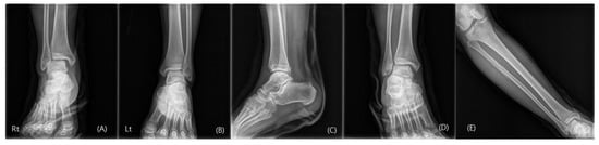 - Ramsey, P.L.; Hamilton, W. Changes in tibiotalar area of contact caused by lateral talar shift. J. Bone Jt. Surg. Am. 1976, 58, 356–357. [Google Scholar] [CrossRef]