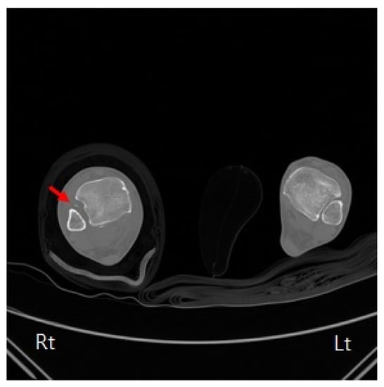Preoperative axial computed tomography scan showing a syndesmotic injury in the right ankle. It can be seen that the fibula is dislocated from the fibula notch (red arrow).