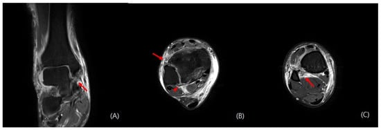 Coronal magnetic resonance imaging (MRI). An area of high signal intensity (red arrow) indicates a deltoid ligament injury (A). Axial MRI showing the anterior inferior tibiofibular ligament (red arrow) and posterior inferior tibiofibular ligament (red arrowhead) injuries (B). Axial MRI showing interosseous membrane rupture (red arrow) (C).