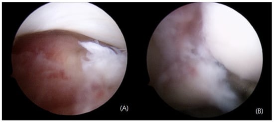 Intraoperative arthroscopic findings of syndesmotic injury with widening of the gap between the fibula and tibia (A), and posterior inferior tibiofibular ligament rupture at the point of tibial insertion (B).