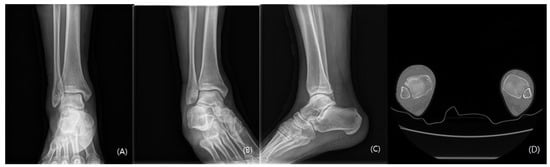 The syndesmosis joint was clearly reduced on the postoperative X-ray ((A) anteroposterior view, (B) lateral view, and (C) mortise view); this was confirmed by axial computed tomography (D).