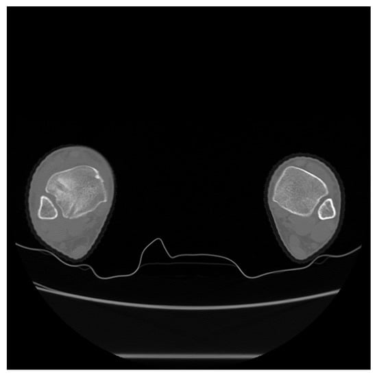 Axial computed tomography performed at the 6-month follow-up exam revealed similar alignment of the syndesmosis between the injured and uninjured sides.