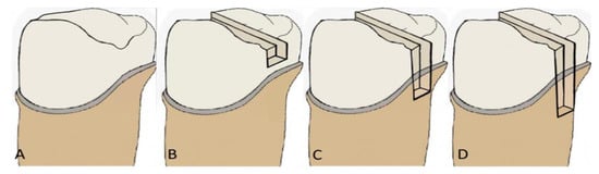 - Roggendorf, M.J.; Krämer, N.; Dippold, C.; Vosen, V.E.; Naumann, M.; Jablonski-Momeni, A.; Frankenberger, R. Effect of proximal box elevation with resin composite on marginal quality of resin composite inlays in vitro. J. Dent. 2012, 40, 1068–1073. [Google Scholar] [CrossRef]