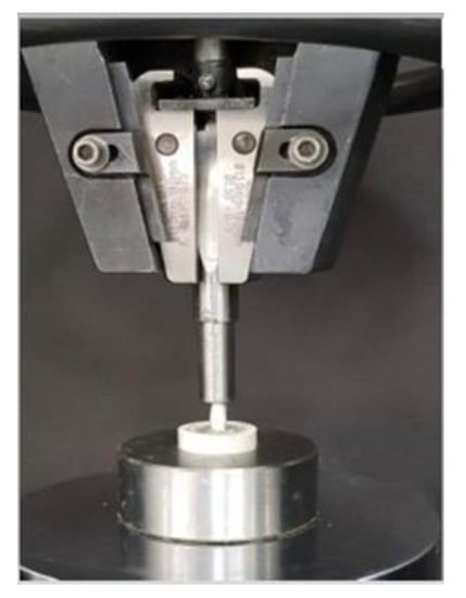 Samples were subjected to a fracture test using the MTS 810 Universal Testing Machine (Eden Prairie, MN, USA). After mounting the samples on a metal base at a vertical angle, a stainless-steel flat-load cell was used, making sure that it contacted both the cusps before the force was applied in a vertical direction along the long axis of the tooth (Figure 2). The maximum force until fracture (1 mm/1 min) of the sample was recorded.