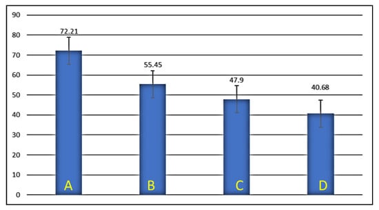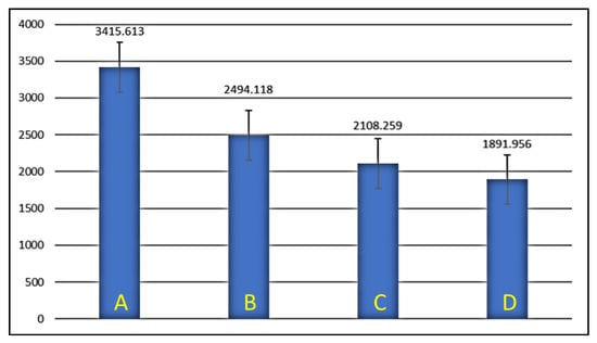 To compare and interpret the results of the experimental data seen in Table 1, analysis of variance (ANOVA) was performed using the mean values of each group, as seen in Table 2 and represented as bar diagrams in Figure 3 and Figure 4.