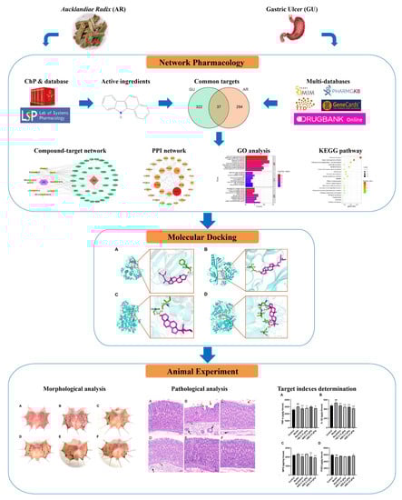 AR is a traditional herbal medicine with gastrointestinal protective effects. In this study, network pharmacology combined with an in vivo experiment were used to explore the potential material foundation, action targets, and possible molecular mechanisms of AR on the treatment of GU in order to explain the gastric protective effect of AR components. As a result, four main bioactive components (stigmasterol, mairin, sitosterol, and dehydrocostus lactone) and 10 core targets (AKT1, PTGS2, IL1B, CASP3, CASP8, CYP2C19, NFKB1, MDM2, BCL2L1, and ESR1) of AR against GU were predicted through the component–target network and PPI analysis. Molecular docking simulations indicated that the predicted main bioactive ingredients and core targets had good binding affinity. The enrichment analysis of GO and KEGG revealed that the protective role of AR against GU involved various GU healing-related biological processes and signaling pathways. Meanwhile, the in vivo experiments showed that the ethanol extract of AR alleviated the GU induced by indomethacin, which was attributed to the regulatory effects of TNF-α, IL-1B, MPO, and PGE2.