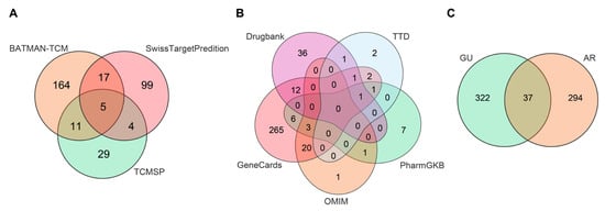 The common targets of AR and GU were obtained using Venny v2.1.0 (https://bioinfogp.cnb.csic.es/tools/venny/index.html, accessed on 25 July 2022), and a Venn diagram was drawn to display visually.