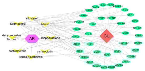 Compound–disease–target network. The purple hexagon represents AR. The yellow triangle represents the active compound contained in AR. The red diamond represents GU. The green ellipse represents the targets.