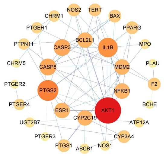 The PPI analysis of targets between AR and GU. The node size and color are proportional to the target degree in the network.