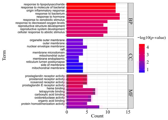 Top 10 significantly enriched terms in biological process (BP), cellular component (CC), and molecular function (MF) of GO analysis. The y-axis represents the GO term. The x-axis represents the gene number, and the color represents the p-value.