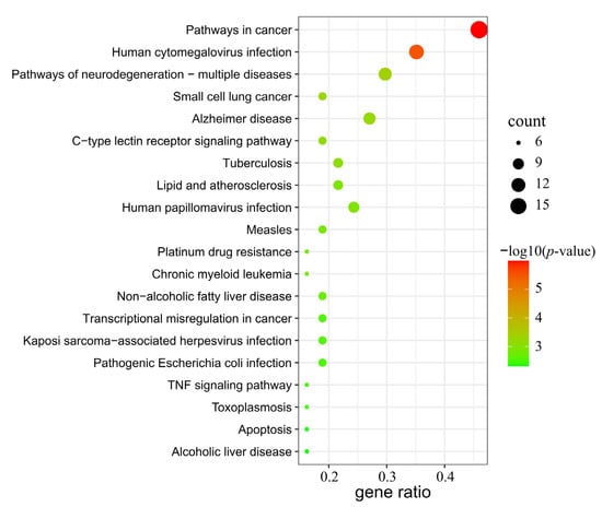The top 20 significantly enriched pathways of the candidate targets of AR in the treatment of GU. The y-axis represents the KEGG pathway. The x-axis represents the ratio of genes enriched in the pathway. The size of bubbles indicates the number of targets, and the color indicates the p-value.