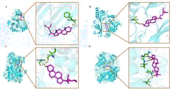 The 3D interaction diagrams of AR core targets against GU. (A) The docking result of AKT1 with stigmasterol. (B) The docking result of AKT1 with sitosterol. (C) The docking result of PTGS2 with stigmasterol. (D) The docking result of PTGS2 with mairin. The purple sticks indicate the ligands, the green sticks indicate the active site residues of targets, and the hydrogen bonds are indicated by yellow dotted lines.