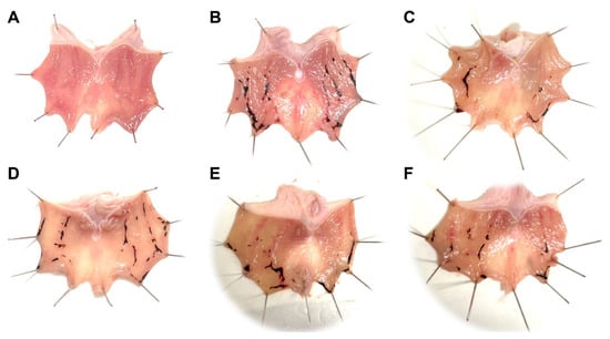 Results of gastric morphology. (A) Control group. (B) Model group. (C) Ranitidine group. (D) ARE 0.15 g/kg group. (E) ARE 0.3 g/kg group. (F) ARE 0.6 g/kg group. ARE, Aucklandia Radix ethanol extract.