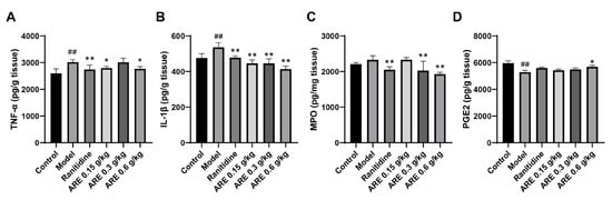 Subsequently, the levels of TNF-α, IL-1β, MPO, and PGE2 in the gastric tissue were detected. The results showed that indomethacin increased the secretion of TNF-α (p < 0.01) and IL-1β (p < 0.01) and MPO, whereas it reduced the secretion of PGE2 in gastric tissues compared to the control group. Notably, the pre-treatment with ranitidine and ARE reversed the above alterations (Figure 10).